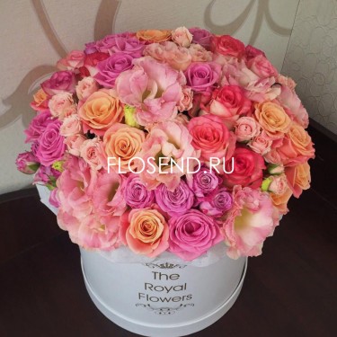 55 роз и эустома Алиса Роуз в коробке