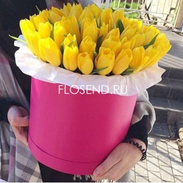 51 желтый тюльпан в розовой коробке