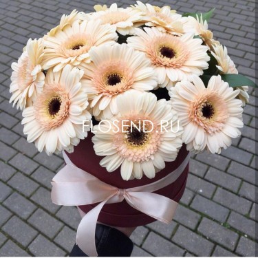 15 кремовых гербер в шляпной коробке