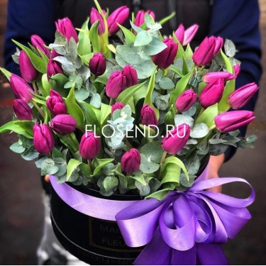 31 тюльпан Перпл Принц и эвкалипт в коробке